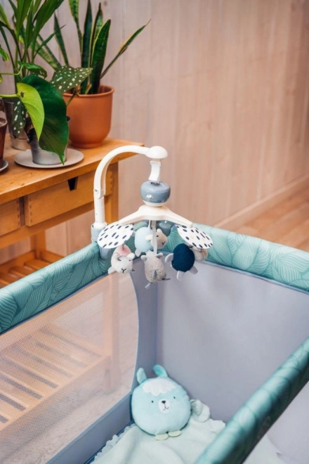 MoMi KIKI is een praktische muziekmobiel die meegroeit met je baby – thuis en onderweg. Dankzij de universele bevestiging klik je hem in een handomdraai vast aan een houten ledikant, geselecteerde reisbedjes, een kinderwagen of autostoel. Gedempte kleuren leiden niet af en zachte melodieën met witte ruis ondersteunen een rustige slaap.