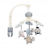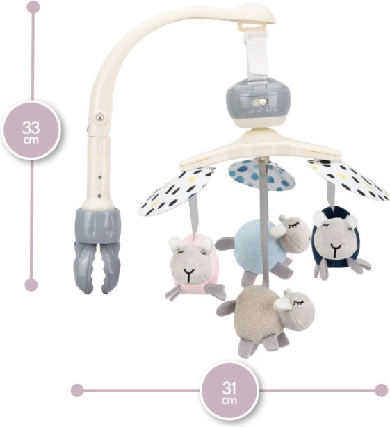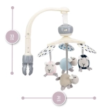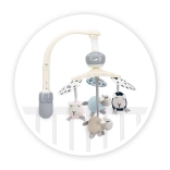 Bijgeleverd zijn zachte sensorische speeltjes van hoogwaardige stoffen (fluweel, vilt) met knisperende en piepende elementen. De speeltjes zijn eenvoudig afneembaar en afzonderlijk te gebruiken of in de wasmachine te wassen. De langzame rotatie ondersteunt het visuele waarnemen en de concentratie van je baby.