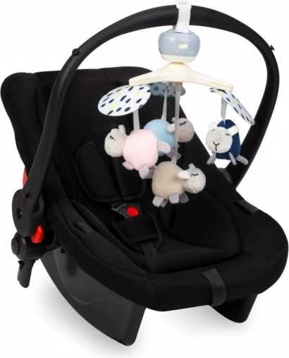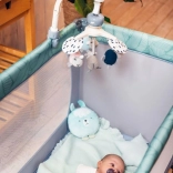 Bevestig de mobiel boven het ledikant met de klem, of aan de kinderwagen en autostoel met klittenband. Eén oplossing voor thuis en onderweg.