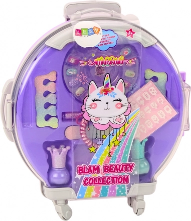 Deze draagbare beautyset in een schattige paarse koffer zal alle kleine stylistes blij maken. Kinderen kunnen nagels lakken, stickers plakken en een lichte make‑up proberen, allemaal netjes opgeborgen in de compacte koffer met wieltjes en handvat. Een geweldige keuze voor uitstapjes, bezoekjes en dagelijks spel.