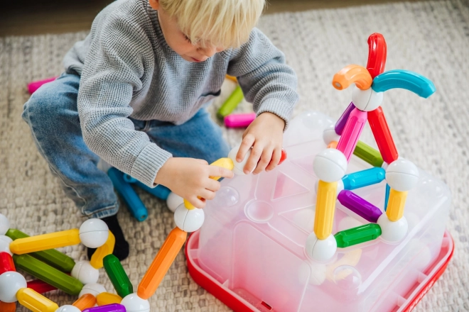 Ontdek de grote SMARTMAX-set voor kleine bouwers: een container met 100 magnetische onderdelen voor het maken van grote bouwwerken, bruggen en constructies. Geschikt vanaf 1 jaar, ideaal voor thuis, kinderdagverblijven en speelhoeken. Praktische container met een rood deksel en rode bodem die als bouwplaten dienen voor gemakkelijk opbergen en bouwen. Veilige magnetische bouwset conform de normen ASTM F963 en EN71.