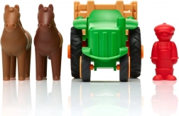 De set bevat een tractor en twee paardjes, die kinderen naar eigen inzicht kunnen bouwen. De boerfiguur voegt extra plezier toe, waarbij fantasierijk spel en ontwikkeling van sociale vaardigheden bij kinderen worden gestimuleerd. Met heldere kleuren en een eenvoudig ontwerp is deze bouwset geschikt voor kleine handjes.