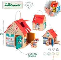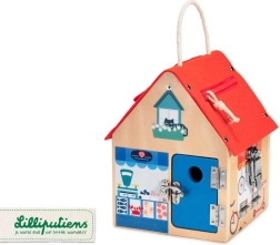 Dit kwalitatief afgewerkte huisje van het Belgische merk LILLIPUTIENS biedt op elke zijde en op het dak een andere activiteit. Kinderen openen en sluiten deurtjes naar verschillende “winkeltjes” (fiets, patisserie, juwelier, levensmiddelen) en ontdekken 6 soorten sluitingen: sleutel, schuifgrendel, sluiting, haak, rits en klittenband. Het textieldak is stevig en met drukknopen bevestigd, en het huisje heeft ook een koordhandgreep voor makkelijk dragen.