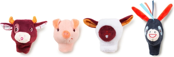 Stel je al die leuke verhalen voor die je aan je kinderen kunt vertellen met behulp van deze schattige vingerpopjes. De set bevat 4 boerderijdieren - een koe, een varken, een schaap en een ezel. Elk vingerpopje heeft zijn eigen uitdrukking. Ezel Ignác lacht, terwijl het schaap zijn tong uitsteekt. Plaats de popjes op je vingers en het theater kan beginnen. Kleine kinderen zullen liever naar het theater kijken, oudere kinderen kunnen zelf meedoen en een verhaal naspelen. Dit spel bevordert de ontwikkeling van verbeeldingskracht en taalvaardigheid.