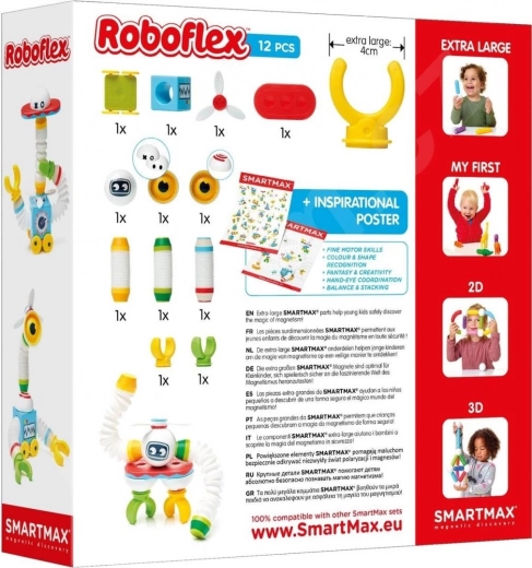 SmartMax Roboflex is een interactieve bouwset die de verbeelding prikkelt en de fijne motoriek ontwikkelt. De flexibele onderdelen bieden een extra dimensie aan het spel en maken het mogelijk unieke figuren en wezens te bouwen die kunnen springen, vliegen en zelfs gewichtheffen.