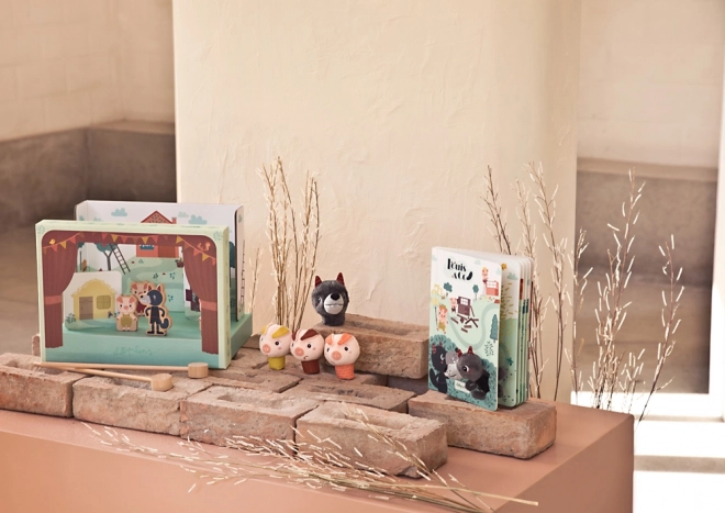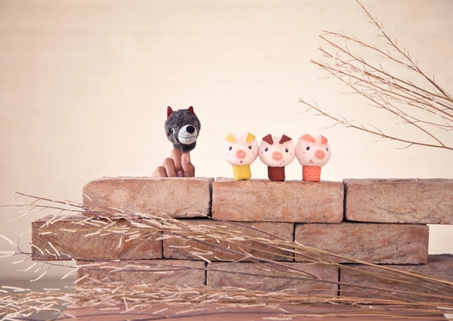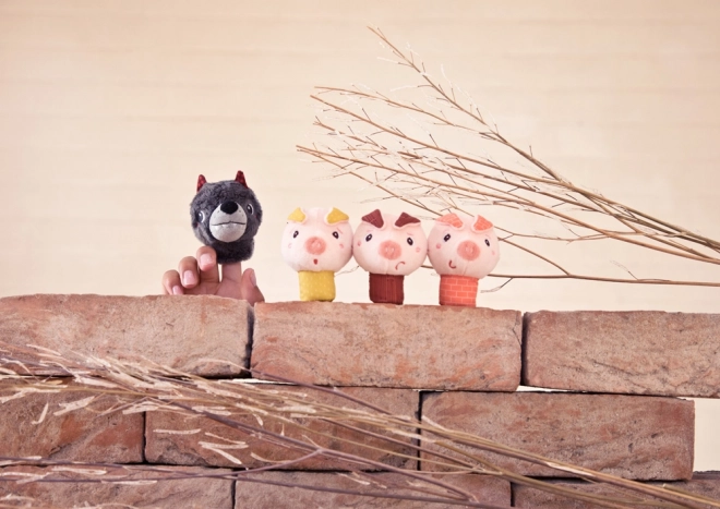 Drie kleurrijke biggetjes en een grijze wolf als vingerpoppetjes van zacht textiel. Aangenaam om aan te raken, ideaal voor scènes thuis en in de kleuterklas.