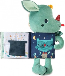 Draak Joe houdt een zacht boekje vol illustraties van bosdieren en magische motieven. De pagina’s knisperen en sommige ratelen om de zintuiglijke waarneming te stimuleren.