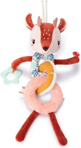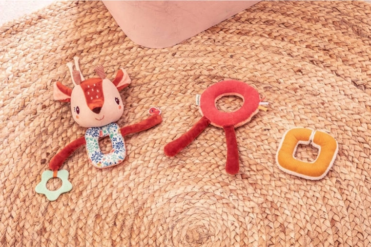 De actieve ketting Hertje Stella bestaat uit zachte schakels die met een magnetische middenring aan elkaar worden gekoppeld. In het hoofdje van het hertje zit een rammelaar, één oortje knispert en op het pootje vind je een schattig vogeltje – een sensorische applicatie. Aan het andere pootje hangt een stervormige bijtring met nopjes voor verlichting bij doorkomende tandjes.