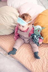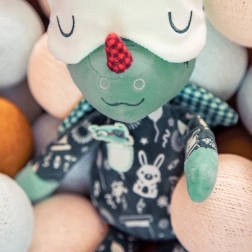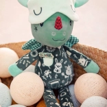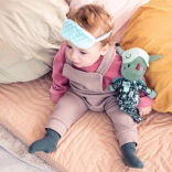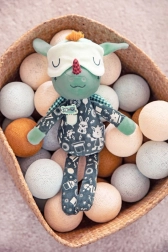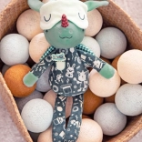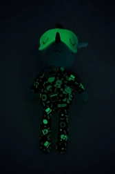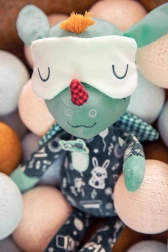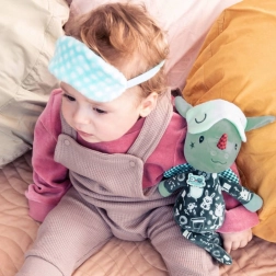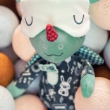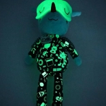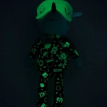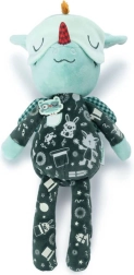 Draakje Joe in een donker pyjamaatje met zakje en borduursels is 32 cm hoog en betovert elk kindje. De fluorescerende elementen op de pyjama en het verschuifbare slaapmasker geven zacht licht in het donker, zodat het kind ’s nachts rustiger is. Geborduurde details, zachte stoffen en een veilige uitvoering zonder harde onderdelen maken hem tot een geweldige vriend voor knuffelen, kalmeren en fantasierijk spel.