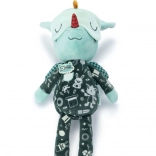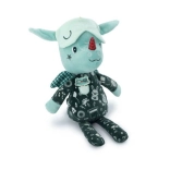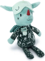 Verschillende texturen, een zakje en kleine details (vleugeltjes, oortjes, hoorn) stimuleren tast en zicht en wekken nieuwsgierigheid.