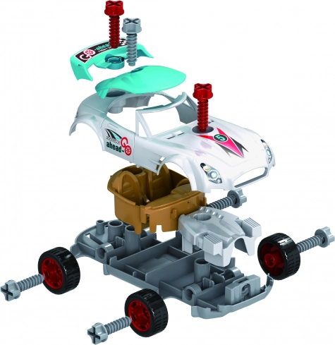 Het stapsgewijs in elkaar zetten van het raceautootje stimuleert de verbeelding, het geduld en het herkennen van vormen en kleuren. Dankzij de twee schroefmogelijkheden kiezen kinderen wat hen het beste ligt en trainen ze spelenderwijs de behendigheid van beide handen.
