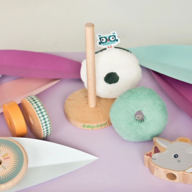 Dit speelse motorische speelgoed geeft kinderen plezier in het ontdekken van vormen en materialen. Het variabel stapelen prikkelt de verbeelding en leert geduld en concentratie. Door de combinatie van houten en textiele elementen voelt de piramide prettig aan en is hij veilig voor kleine handjes.