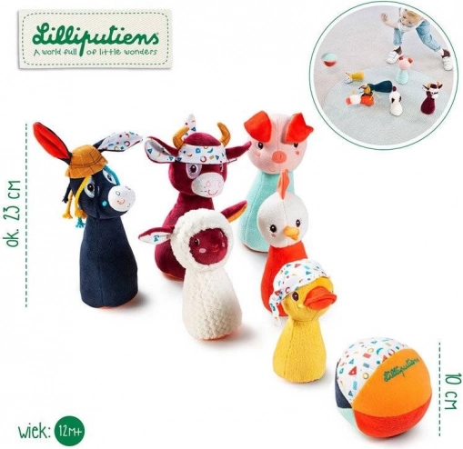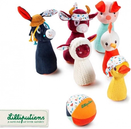 Ontdek de charme van de zachte Lilliputiens-kegels uit de Boerderij-collectie. De vrolijke helden – ezel Ignace, koe Rosalie, varkentje Simon, schaap Yvon, kip Paulette en eend Gaston – hebben een stabiele onderkant met lichte verzwaring, waardoor ze gemakkelijk neer te zetten en net zo makkelijk om te gooien zijn. De set bevat ook een kleurrijk pluche balletje met belletje, dat uitnodigt tot gooien en rollen.