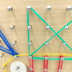 Kinderen kunnen basis geometrische vormen en symmetrie leren, of unieke ontwerpen creëren. De Geoboard is ook een geweldig hulpmiddel voor leren rekenen en meten.
