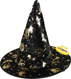 Geef een kinderkostuum de perfecte magische finishing touch. De lichte en comfortabele hoed in het zwart is bezaaid met gouden decoraties die prachtig glinsteren in het licht. Zit uitstekend en is gemakkelijk te combineren met een cape en masker.