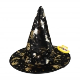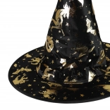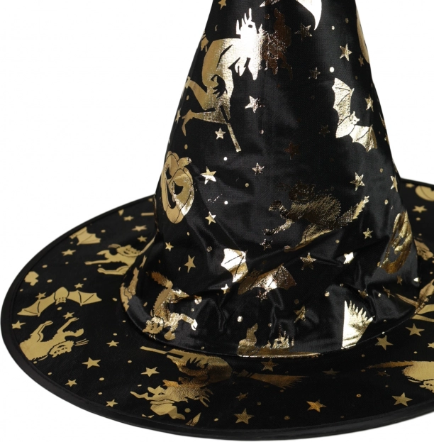 Stijlvolle kinder-tovenaarshoed, ideaal voor carnaval, schoolfeestjes en Halloween. De zwarte stoffen hoed is versierd met gouden magische motieven zoals sterren, vleermuizen en heksen. Dankzij de klassieke kegelvorm en de brede rand past hij bij elk kostuum en tovert hij elke kleine goochelaar om tot een Halloween-ster.