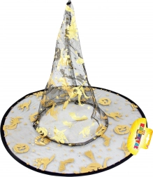 Geef je kind een onvergetelijke ervaring met deze toverhoed, die een betoverende look brengt naar elk Halloweenfeest. De hoed is gemaakt van licht zwart gaas en versierd met gouden afbeeldingen die stralen bij elke verlichting.