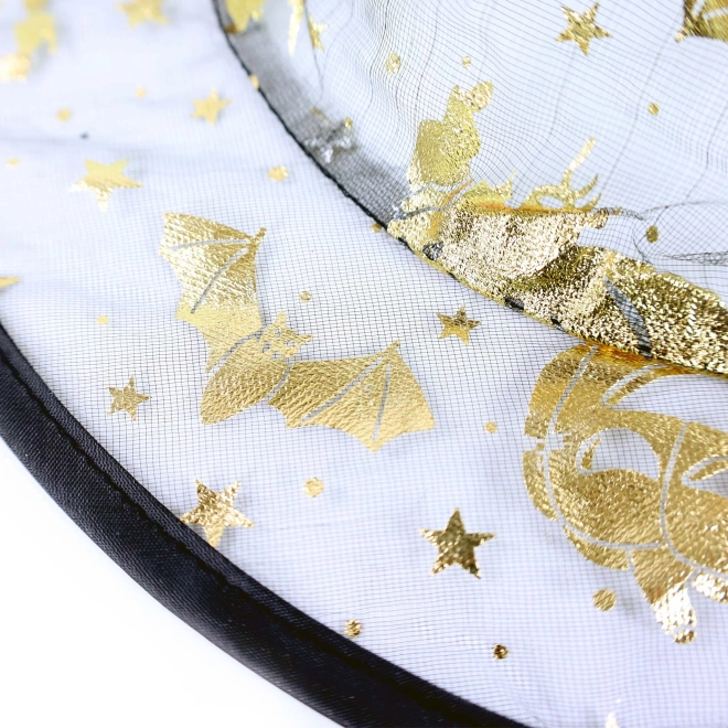 De hoed is versierd met zwarte en gouden motieven zoals pompoenen, sterren en heksen, wat een mysterieuze uitstraling geeft.