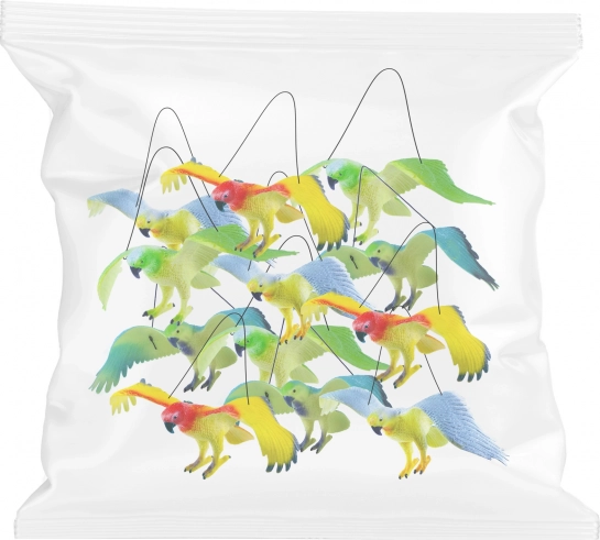 Kies je kleurrijke metgezel! Deze hangpapegaai aan een elastiek valt op door levendige kleuren, een vleugelspanwijdte van ca. 30 cm en geeft bij indrukken een fluitend geluid. Perfect als decoratie voor de kinderkamer, om mee te spelen of te verzamelen. De vermelde prijs is per stuk; papegaaien worden uitsluitend per volle verpakking van 12 stuks verkocht.