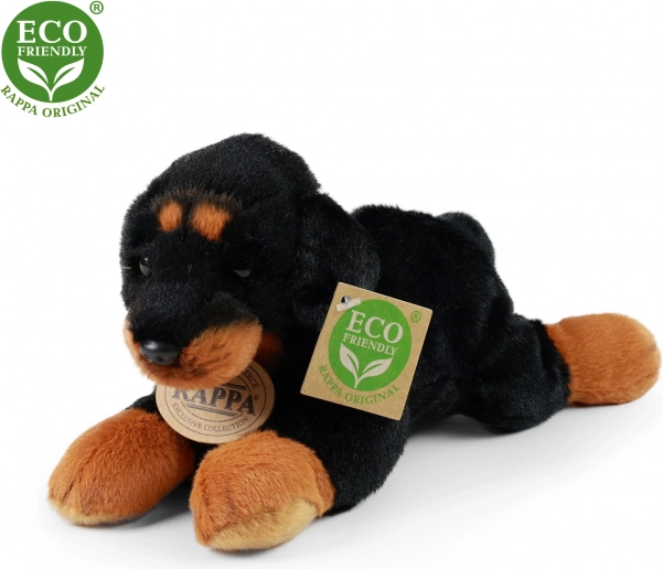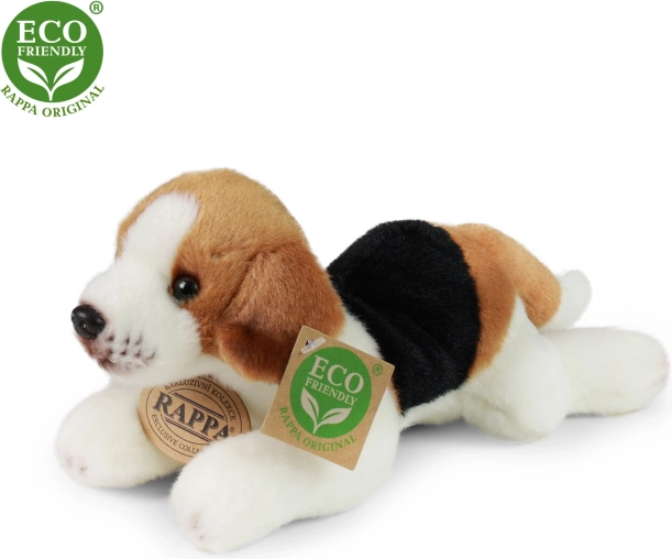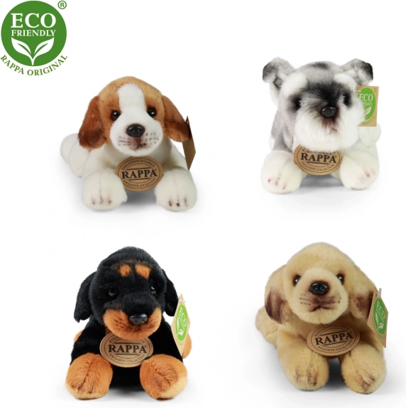 Pluchen hond liggend met een grootte van 16 cm, beschikbaar in verschillende rassen zoals beagle, schnauzer, labrador of rottweiler. Gemaakt van ecologische materialen die aan alle veiligheidsnormen voldoen.