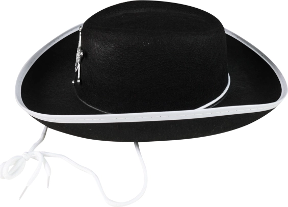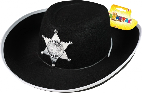 Geef het kostuum van een kleine cowboy een authentieke uitstraling. Deze kinder-cowboyhoed in elegant zwart is versierd met een opvallende sherifster en een witte rand rondom, wat een stijlvol contrast geeft. De kinriem zorgt ervoor dat de hoed goed blijft zitten, ook tijdens het ravotten.