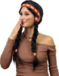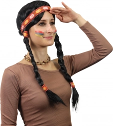 Stijlvolle carnavalspruik met dubbele vlechten en een decoratieve hoofdband die je kostuum een authentieke Indiaanse touch geeft. Dankzij de lange zwarte vlechten, de decoratieve hoofdband en het comfortabele draaggevoel is hij ideaal voor carnaval, themafeesten en cosplay. De kleur van de linten kan variëren.