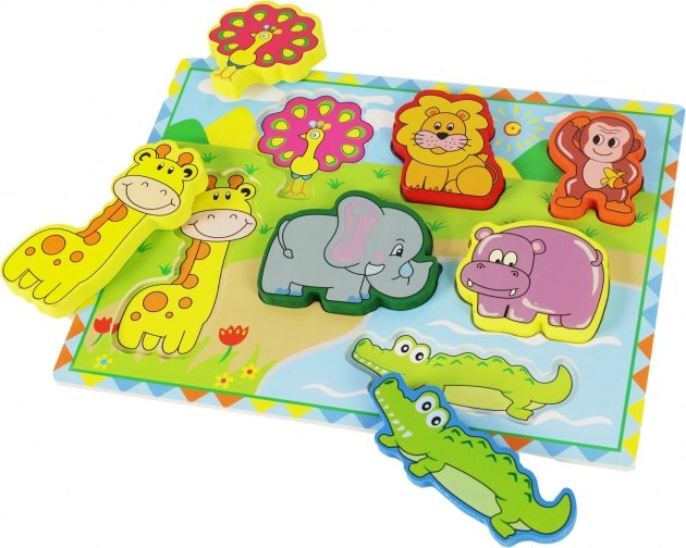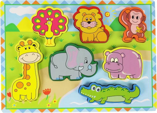 Houten 3D inlegpuzzel met safari-dierenmotieven is ideaal voor de ontwikkeling van de motorische vaardigheden van kinderen door het leuke invoegen van vormen.