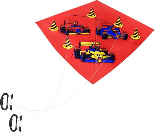 De vlieger is versierd met motieven van raceauto’s en verkeerskegels, wat zijn uitstraling speels en avontuurlijk maakt.