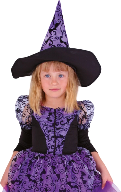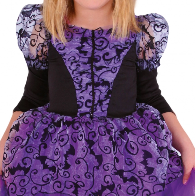 Kinder heksenkostuum in maat S, geschikt voor kinderen van 3-6 jaar (105-116 cm), brengt plezier en magie naar elke gelegenheid. De paarse jurk heeft een luchtige rok en driekwart mouwen, versierd met een zwart vleermuismotief voor een authentieke uitstraling.