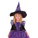 Het kostuum wordt geleverd met een bijpassende hoed, versierd met hetzelfde patroon als de jurk, wat het kostuum een authentieke heksenlook geeft.