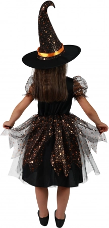 De jurk is rijkelijk versierd met oranje accenten en metallic sterretjes die direct de aandacht trekken. Het kostuum bevat ook een heksenhoed, wat de set een authentieke look geeft.