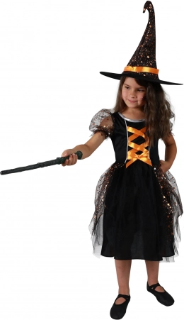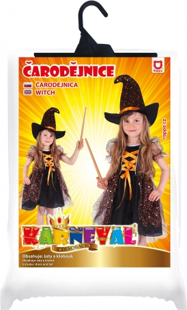 Ontdek het magische carnavalskostuum van een heks, bedoeld voor meisjes van 8-10 jaar. Zwarte jurk met oranje linten en metallic sterretjes zorgt voor een verbluffende look. Vergeet de heksenhoed niet, die het hele kostuum perfect completeert.