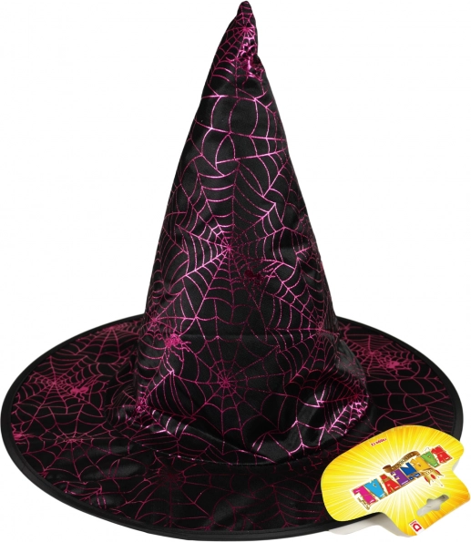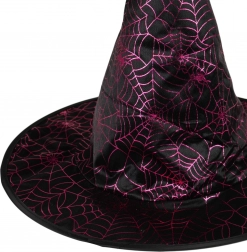 Een vrolijke heksenhoed is een geweldige accessoire voor carnaval! De zwarte hoed is versierd met paarse, glinsterende spinnenwebben.