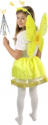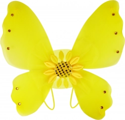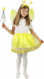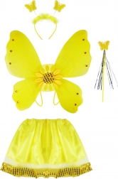 - Vleugels met zonnebloem en steentjes; luchtig rokje met gouden pailletten; diadeem met metallic vlindertjes; toverstaf