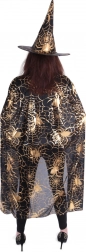 De zwarte cape met gouden spinnenwebben en spinnen schittert in het licht en trekt de aandacht op elk feest.