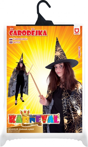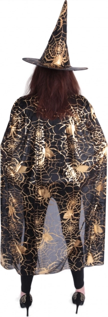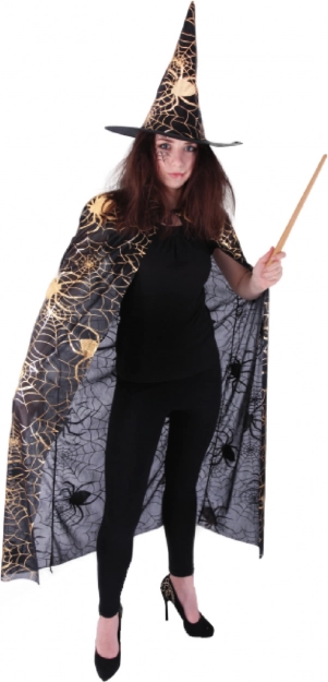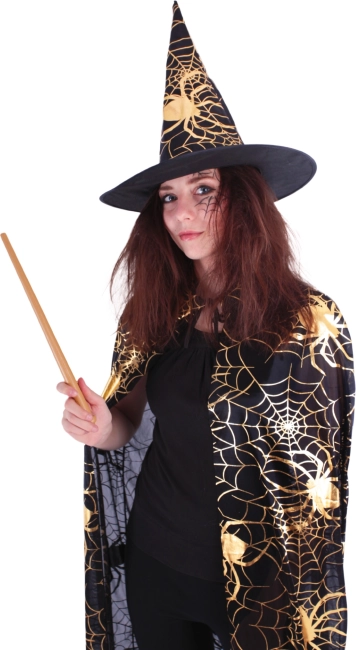 Stap de wereld van magie binnen met deze elegante set voor volwassenen – een zwarte cape met gouden spinnenwebmotieven en een bijpassende puntige hoed vormen een mystieke, opvallende en fotogenieke outfit voor Halloween, carnaval en themafeesten. Het lichte materiaal zorgt de hele avond voor comfortabel draagplezier. Tovenaarstok niet inbegrepen.