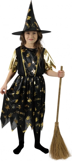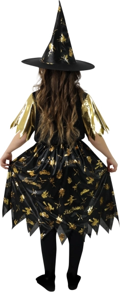 Dit opvallende kinderkostuum heks in zwart‑goud is ideaal voor Halloween, carnaval en themafeesten. De jurk met subtiel glinsterende gouden patronen en zigzagzoom zorgt voor een echte toverachtige sfeer, aangevuld met een perfect passende puntige hoed.