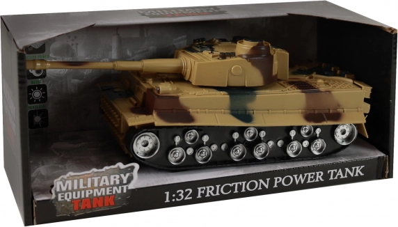 Dankzij het frictie- (inertie)mechanisme rijdt de tank na het terugtrekken vooruit. De praktische schaal 1:32 ligt goed in de hand.