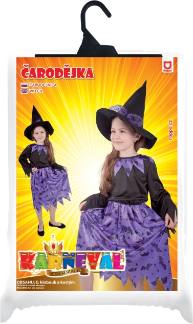 Prikkel de fantasie met een elegant heksenkostuum in de geliefde zwart‑paarse combinatie met vleermuismotief. De set bevat een jurk en een puntige hoed met strik, dus trek schoenen aan, voeg een bezem of accessoires toe en het plezier kan beginnen.