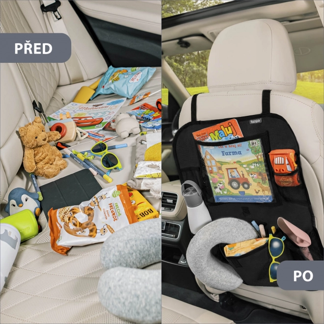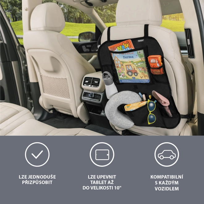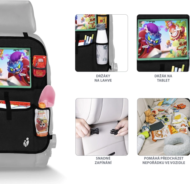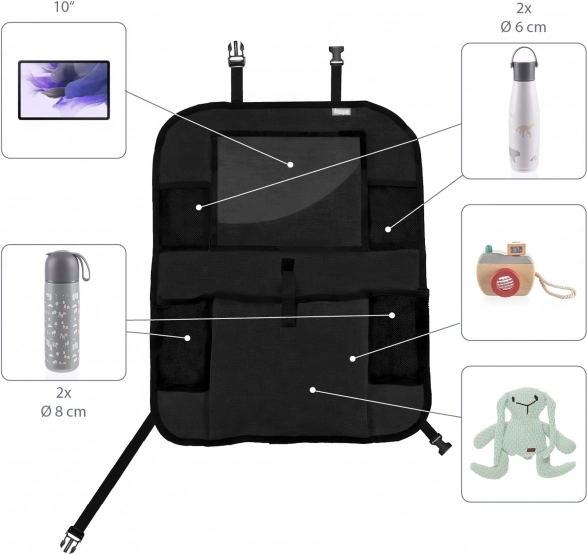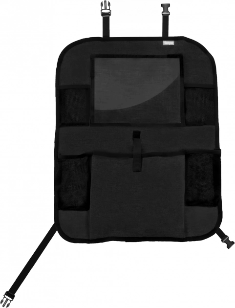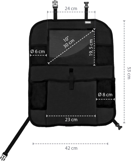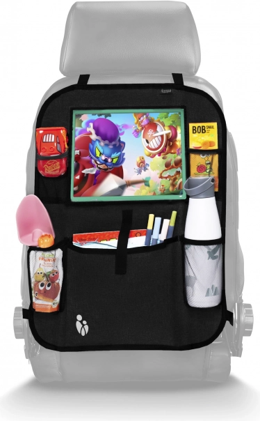 Praktische organizer voor de achterkant van de autostoel met een transparant tabletvak, ideaal voor familietrips. Biedt snelle toegang tot de tablet, bescherming van het aanraakscherm en voldoende opbergruimte voor kleine spullen en drankjes. Universele bevestiging met verstelbare gespen zorgt voor compatibiliteit met de meeste voertuigen.