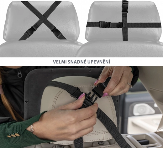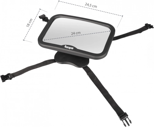 De montage is snel en intuïtief – de verstelbare riemen maken bevestiging aan de meeste hoofdsteunen mogelijk en zorgen voor een stabiele fixatie in de vorm van een “X” of een “kruis”. De spiegel maak je eenvoudig schoon met een droge of licht vochtige doek, zodat hij altijd klaar is voor gebruik.