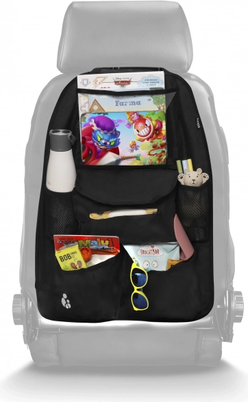 De stoelorganizer met tablethoes biedt opbergruimte en maakt autoritten gemakkelijker.