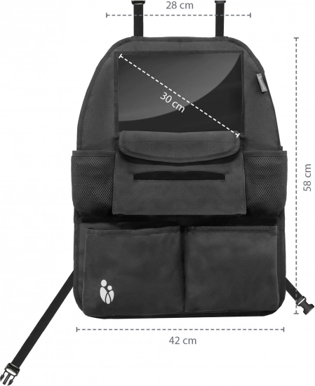 De slimme stoelorganizer beschermt niet alleen de tablet en biedt er eenvoudige toegang toe, maar biedt ook veel opbergruimte voor flessen, zakdoekjes en speelgoed.