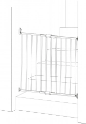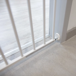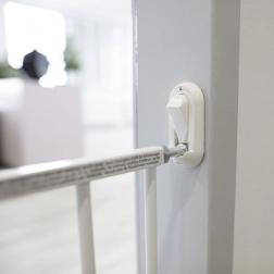 De robuuste metalen uitvoering in neutraal wit past in elk interieur. Het hekje is bedoeld voor kinderen tot 24 maanden en voldoet aan de veiligheidsnorm EN 1930:2011. Het oppervlak is gemakkelijk schoon te maken, waardoor onderhoud zo gebeurd is.