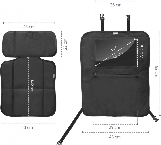 Het onderste deel beschermt de zitting onder het autostoeltje, het bovenste deel bedekt de rugleuning tegen vuil van schoenen. Kan samen of afzonderlijk worden gebruikt.