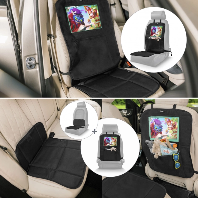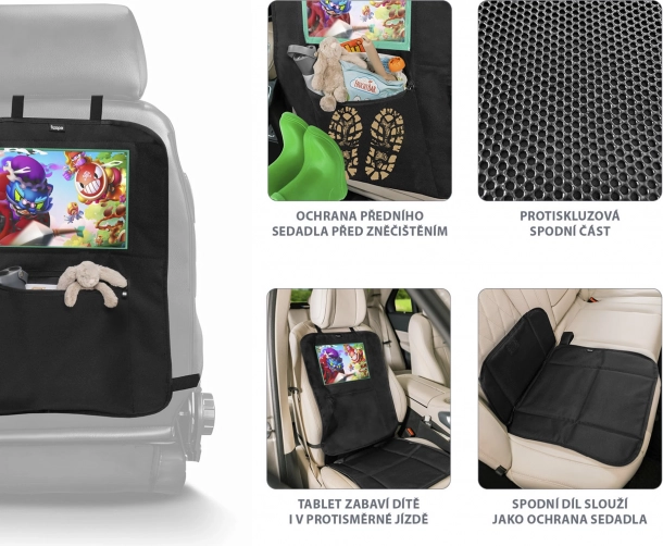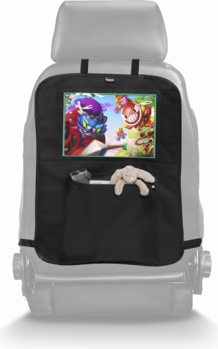 De tweedelige constructie maakt flexibel gebruik mogelijk, afhankelijk van de leeftijd van het kind en het type rit. Het onderste deel beschermt de zitting tegen deuken en vuil van het autostoeltje, terwijl het bovenste deel voorkomt dat de rugleuning vuil wordt door schoenen en dankzij het transparante vak zorgt voor een veilige plaatsing van de tablet.