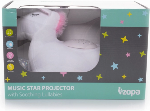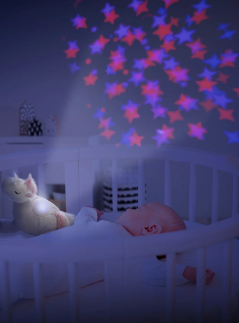 Deze pluche eenhoorn verandert de kinderkamer in een magische plek dankzij de projector die wisselende sterren projecteert.