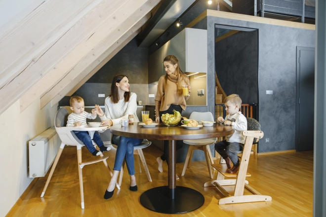 Het elegante wit-grijze design past in ieder interieur. Dankzij de mogelijkheid om de bladen te verwijderen kan de stoel aan de eettafel worden geschoven.