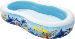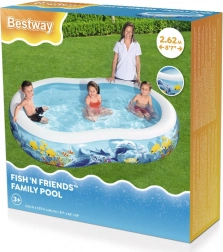 Geniet van de zomer met het ruime opblaaszwembad van BESTWAY met oceaanmotief. Dankzij de ovale vorm, brede wanden en stabiele kamerconstructie is het ideaal voor veilig waterplezier voor kinderen. Gemaakt van duurzaam vinyl, met snelle waterafvoer en eenvoudige opslag.
