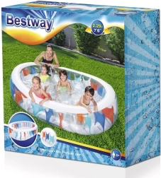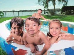 Geniet van de zomer met het ruime opblaaszwembad van 229 × 152 × 51 cm, dat op de meeste tuinen en terrassen past. Transparante wanden met kleurrijke panelen geven een speelse uitstraling en laten je tegelijk duidelijk zicht houden op de kinderen in het water.
